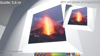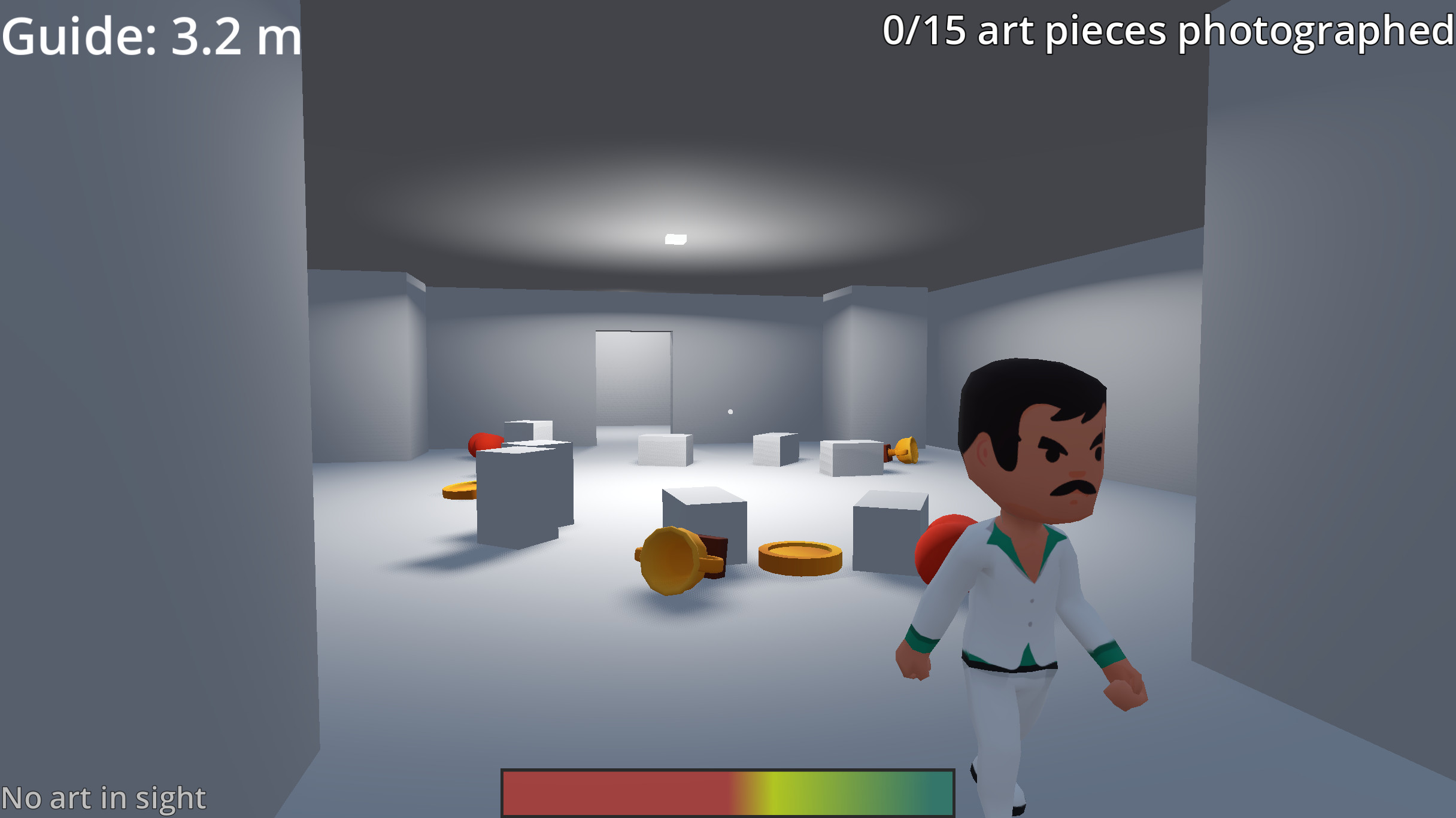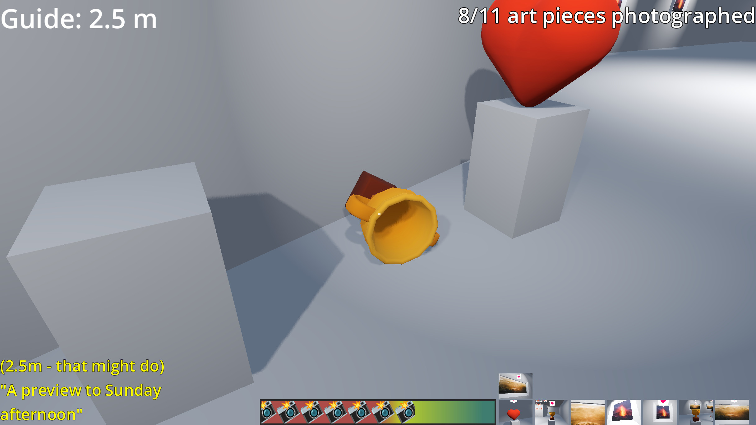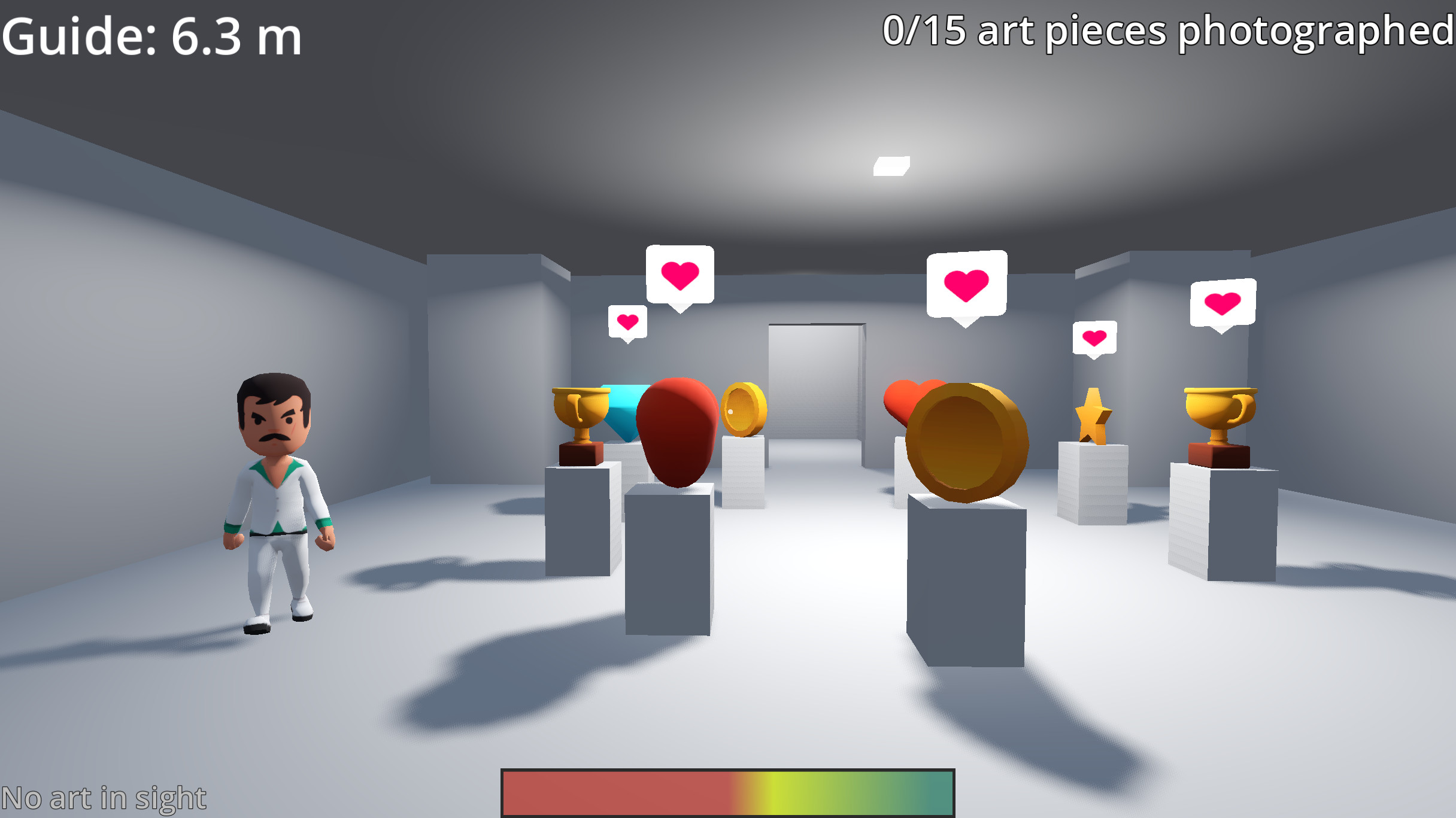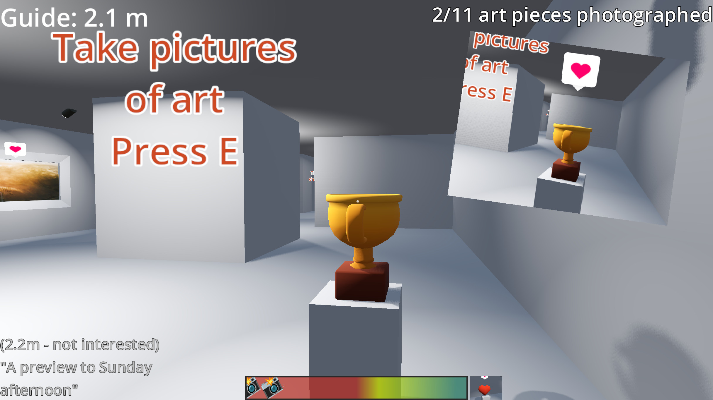 Taking pictures of interesting art awards points. Get closer for higher score; see indicator in the bottom left. Knocking things over will reduce your score, as will taking pictures of uninteresting art pieces (those without a heart-card over them).